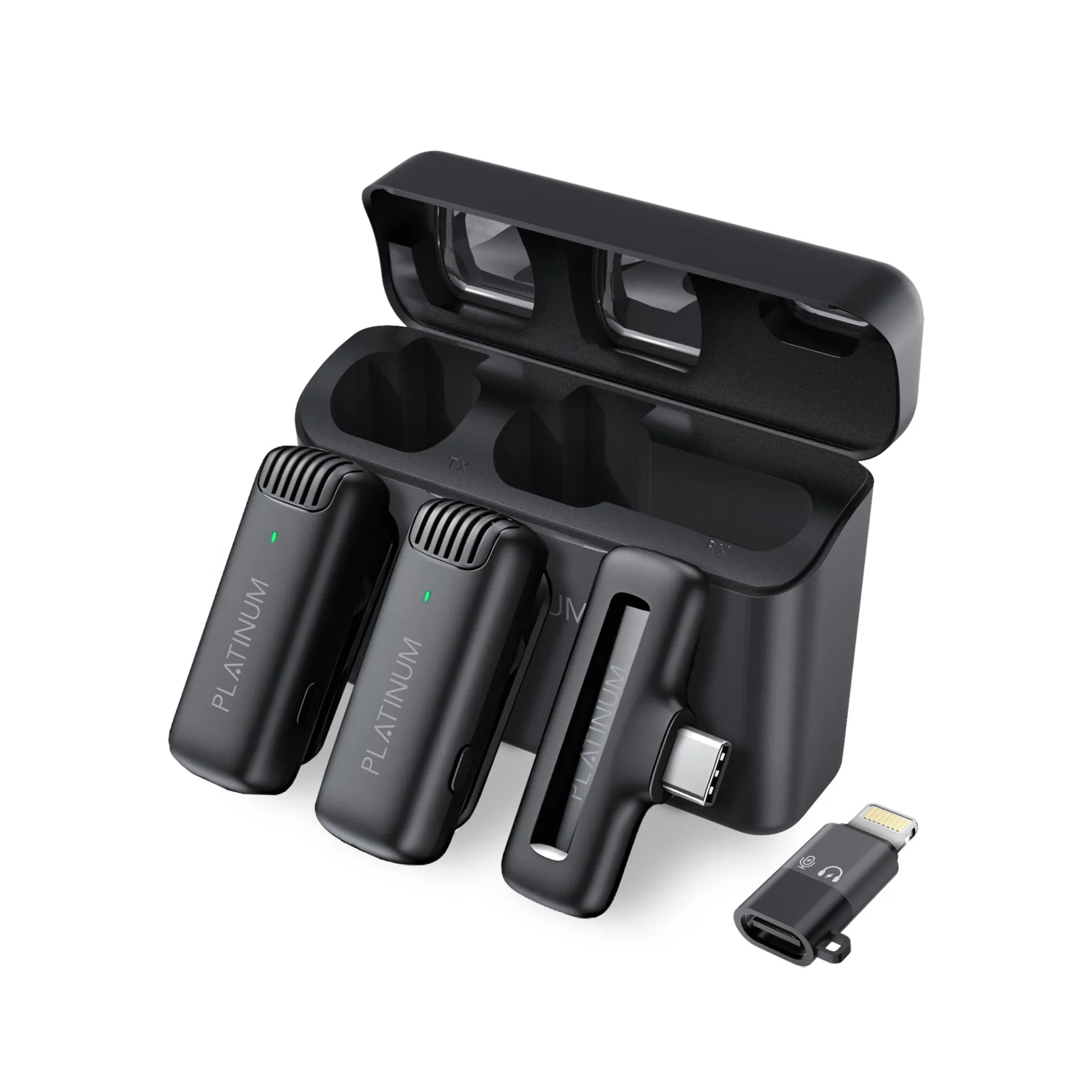 Professional dual wireless lavalier microphones with charging case. Compatible with iOS, Type-C devices. Ideal for content creators and interviews.